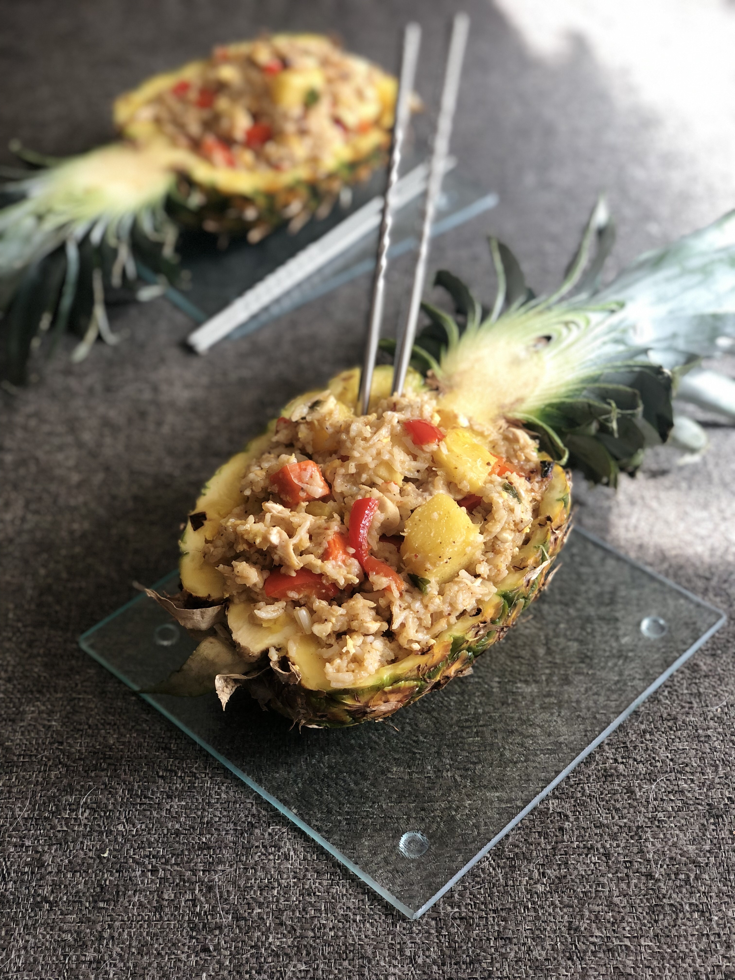 - Stir and continue to cook over a high heat before adding pineapple. Add some chopped green onions and some chopped cashews.