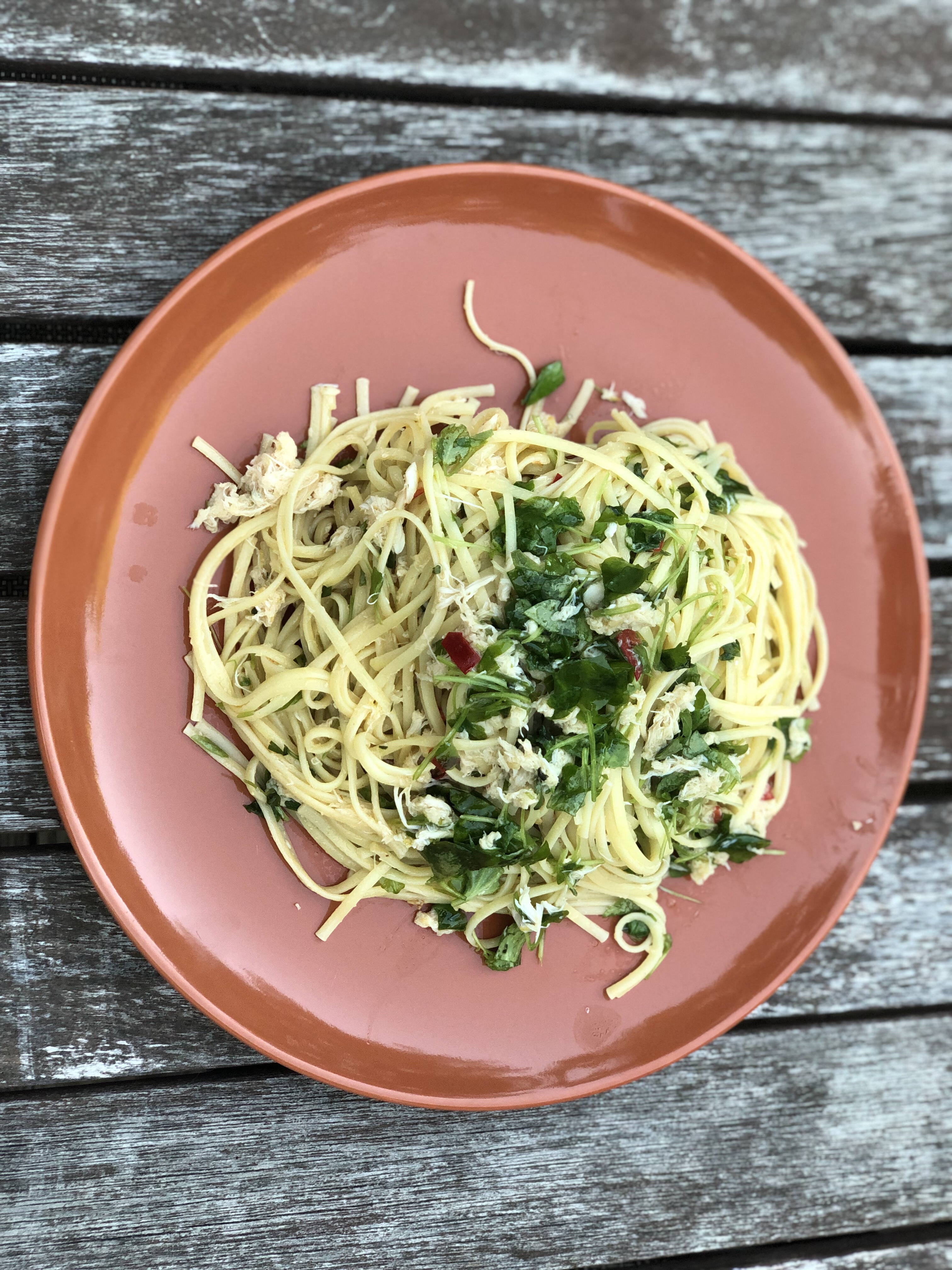 Add the pasta to the boiling water and cook as per instructions on the box and then drain the pasta and move it into a large serving bowl. Add the crab mixture, parsley and watercress and toss the pasta about it.