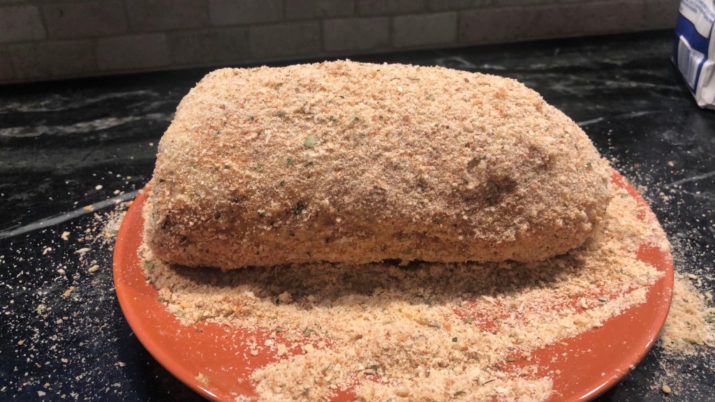 After the roll is set unwrap the chicken cordon bleu, prepare 3 separate large, wide dishes with the flour, beaten egg, and bread crumbs. Dredge the chicken first in the flour, then the egg, and then bread crumbs.