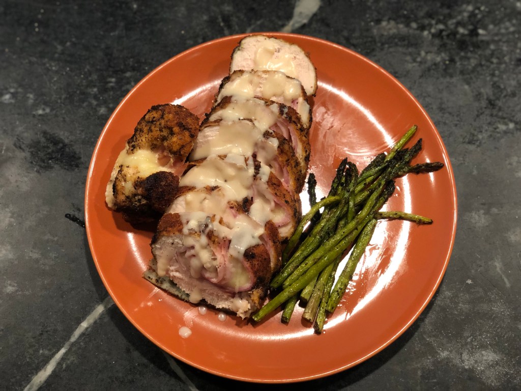 Place the breaded chicken cordon bleu in the oil and cook for about 5 minutes per side, or until the outside is an even golden brown. If a good color is achieved and the chicken’s center is still not 165°F (75°C), place the chicken cordon bleu on a wire rack set over a baking sheet and finish the chicken in the oven at 325°F (170°C) until that temperature is reached.