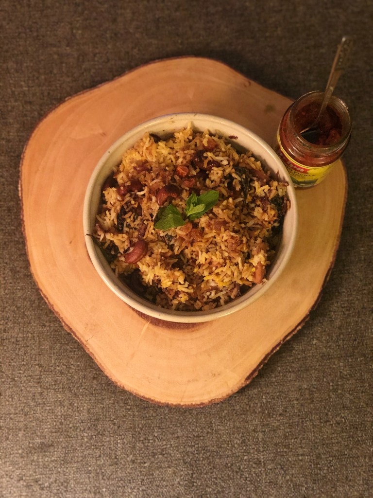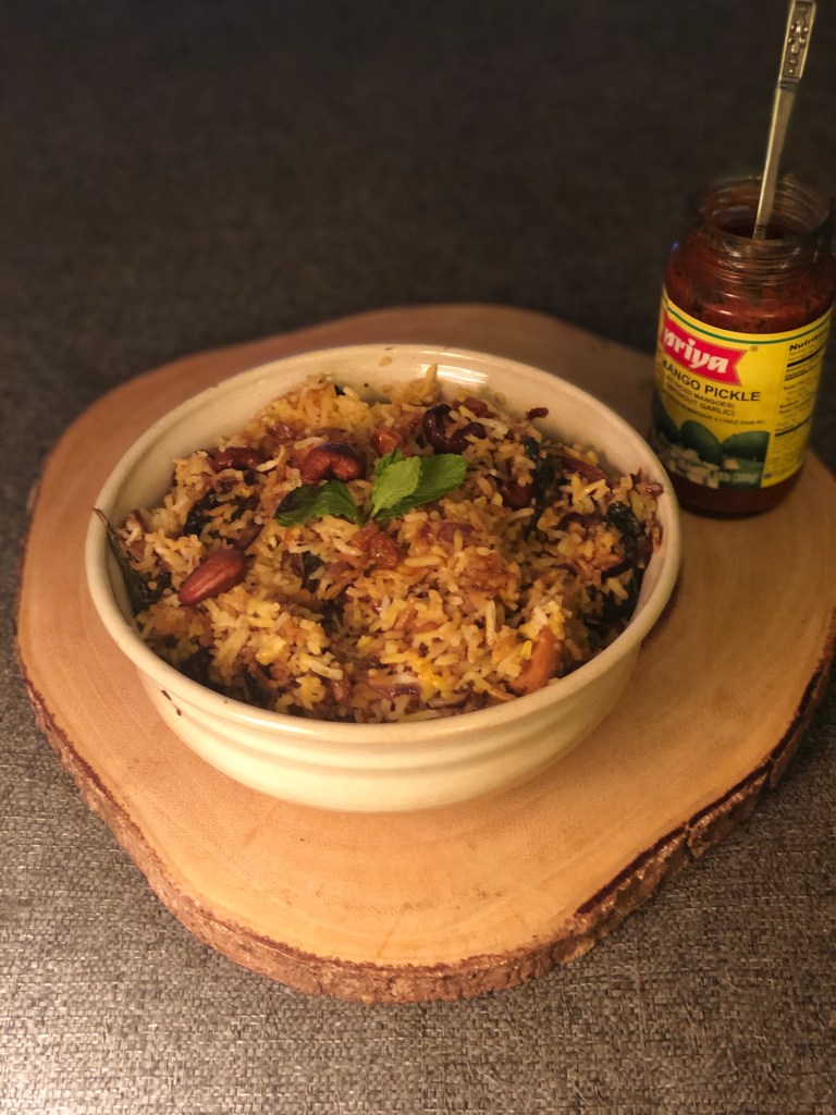 For serving, open the lid and using a wooden spoon gently stir all the layers together and serve with some yogurt and mango pickle (achar).