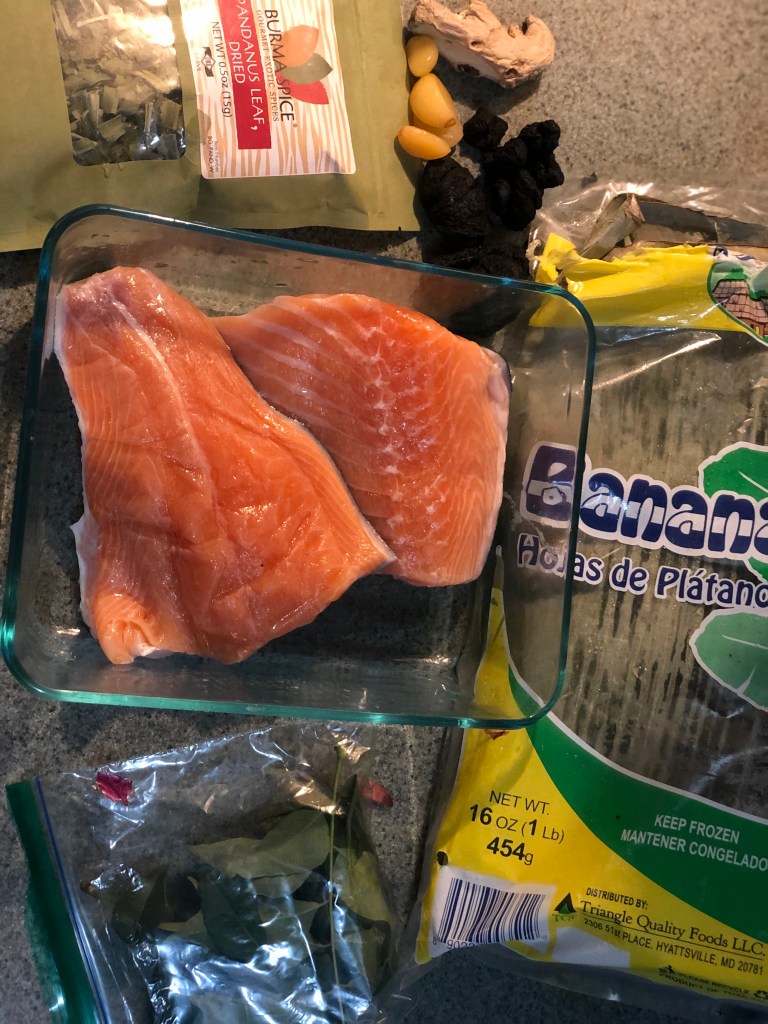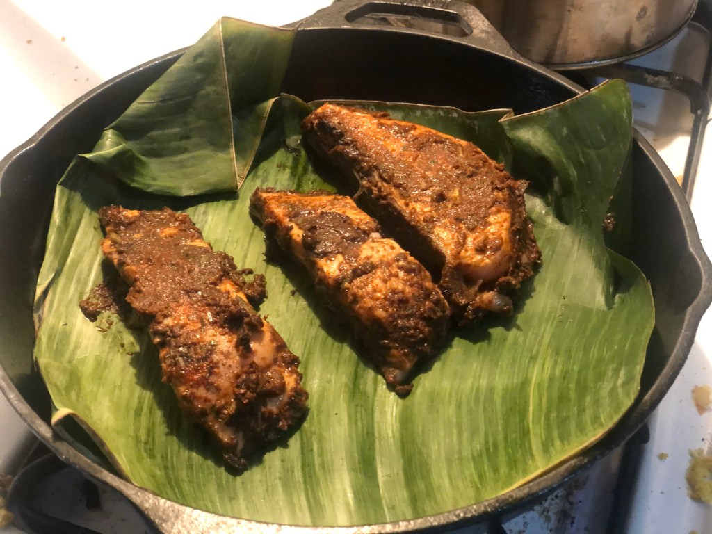 Place a banana leaf in a cast iron pan and pop the fish into the cast iron pan and cover it with another banana leaf and lid and cook for 15 minutes or until cooked through.