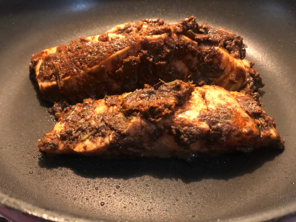 Cut the salmon in into even pieces and rub the paste all over the fishes and marinate it for 20-30 minutes.