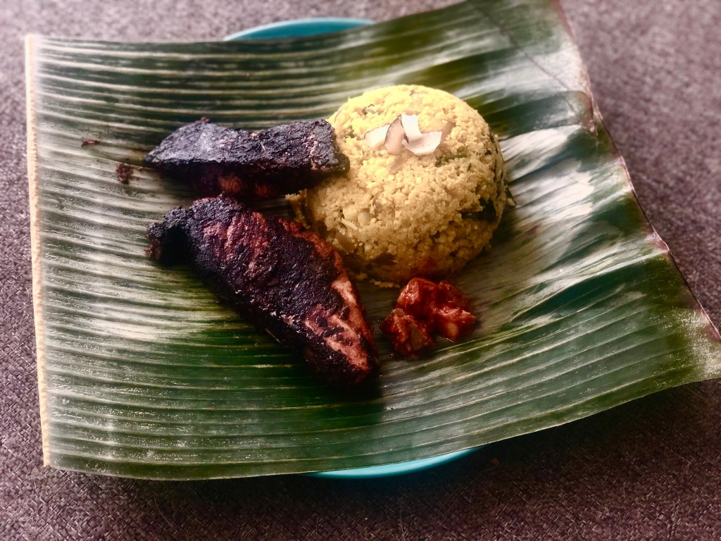 To serve place a banana leaf over a plate and arrange some cauliflower rice and the fish.