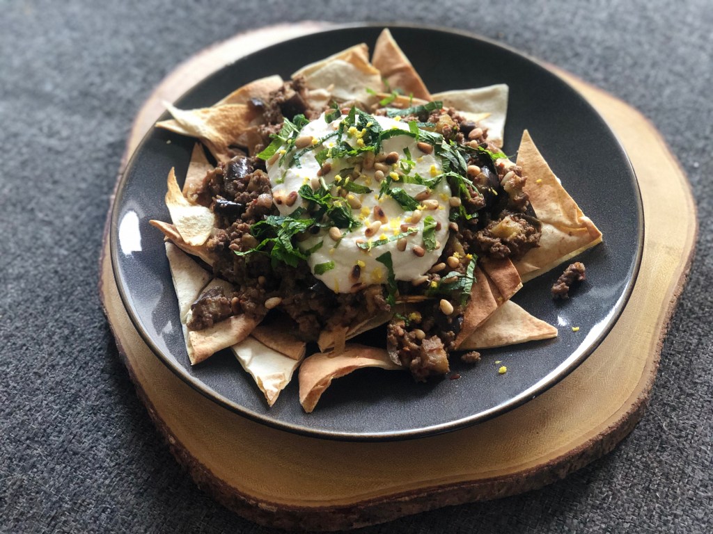 Now for the final assembly, spread out the toasted pita bread on a plate. Top it with the beef and aubergine mixture, followed by the yogurt-tahini sauce. Dust it with some aleppo pepper and lemon zest and scatter the toasted pine nuts, mint leaves.