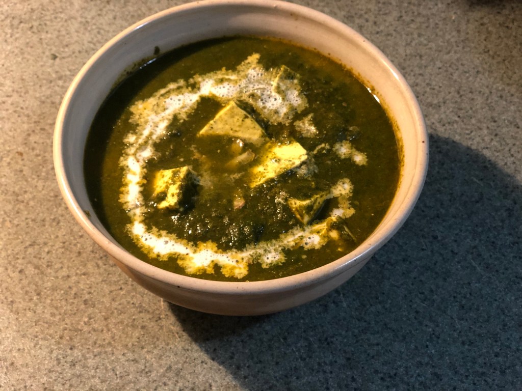 Squeeze out some of the water from the spinach but don’t squeeze it too hard. Add it to a food processor or blender and the diced onions and blend it to a fine paste. Add some water if required.