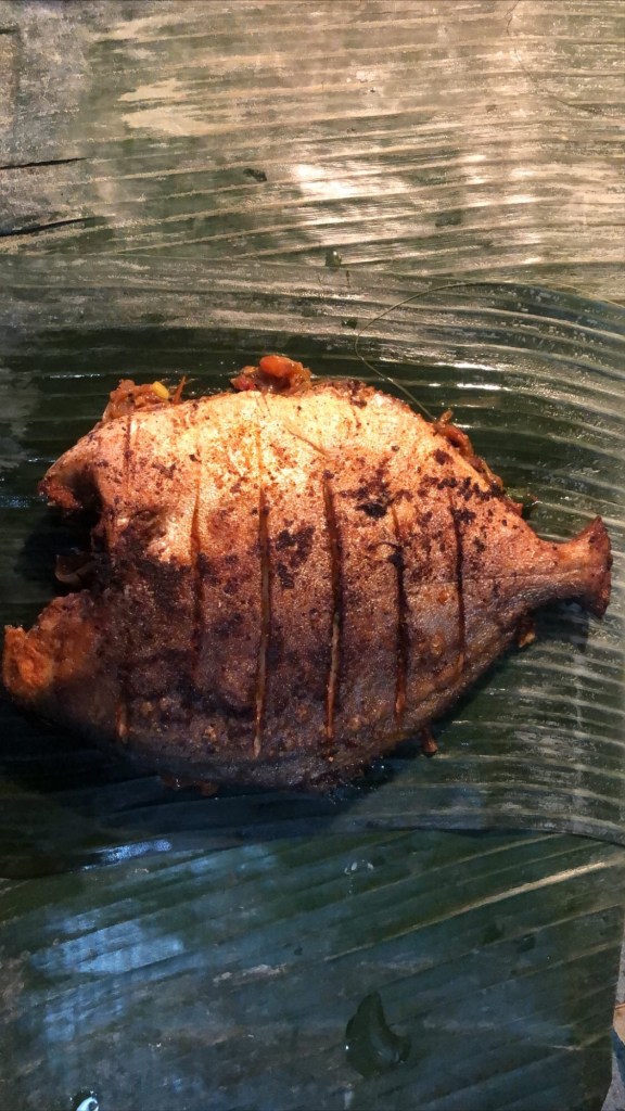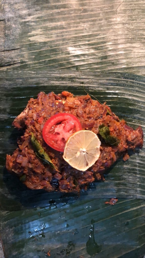 Put some of the onion masala onto the banana leaf. Place the fried fish over the masala and then spread some masala on top of the fish again. Place a piece of lemon slice and tomato slice (this is optional) and wrap the banana leaf and tie it with a string.