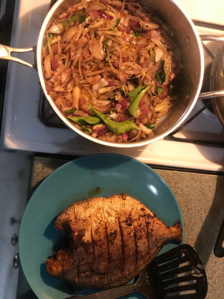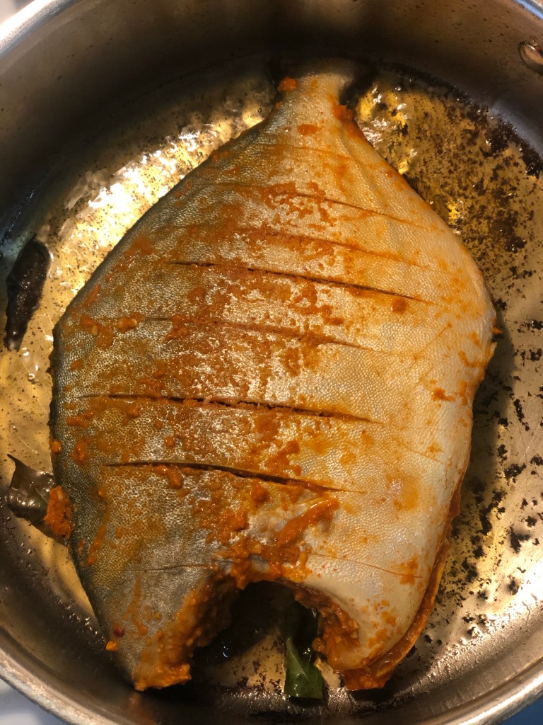 In a pan, heat some oil and then add a spring of curry leaves then add the fish to it. Cook on both sides for 5 minutes each.