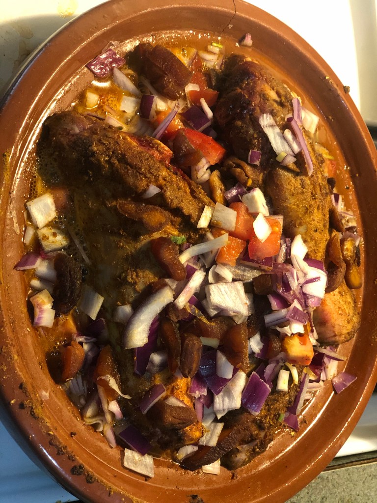 Add the mixture to the bottom of the tagine (if you don’t have a tagine; you can use a dutch oven or any pot) and then place the lamb shanks on top of it and place it on the hob on low heat for 2-2 1/2 hours)