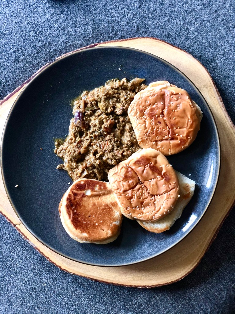 Now add the green chilies and the dry spices (turmeric powder, chili powder, coriander powder and the garam masala). Saute it for 5-10 seconds and mix in the tomato puree. Once the tomato puree is cooked well, add the mint leaves and the cilantro and the minced meat and give it all a good stir. Season it with some salt and cook on medium high heat.