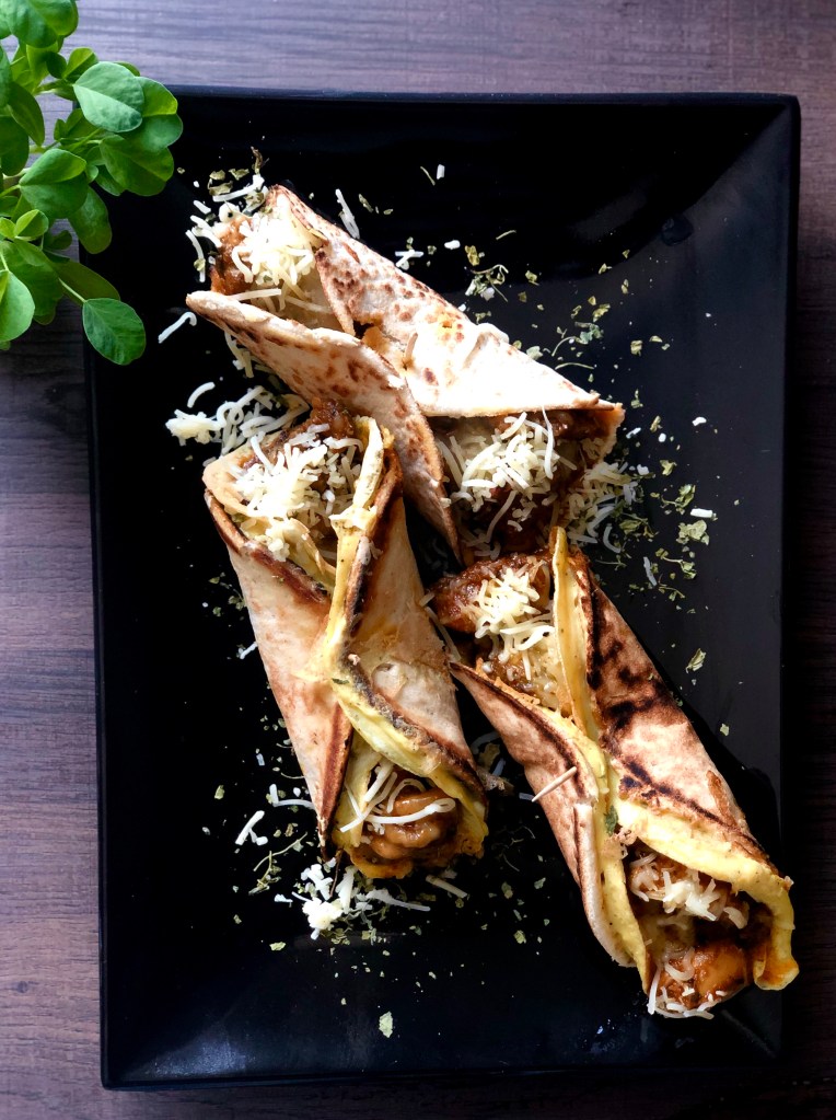 Now with the egg side facing up, place some of the chicken long the center and then sprinkle over cheese as per your liking. Remove it onto a plate and then fold both ends towards the center and you can just pin it down with a tooth pick. Repeat the process to create as many wraps as you like.