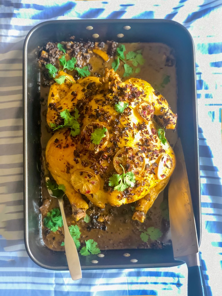Place the chicken in a roasting tray and scatter the rose over the chicken (if using) and roast for 2 hours (This could vary based on the size of the chicken; my chicken came with roasting instructions) or until the internal temperature is 74oC/165oF.