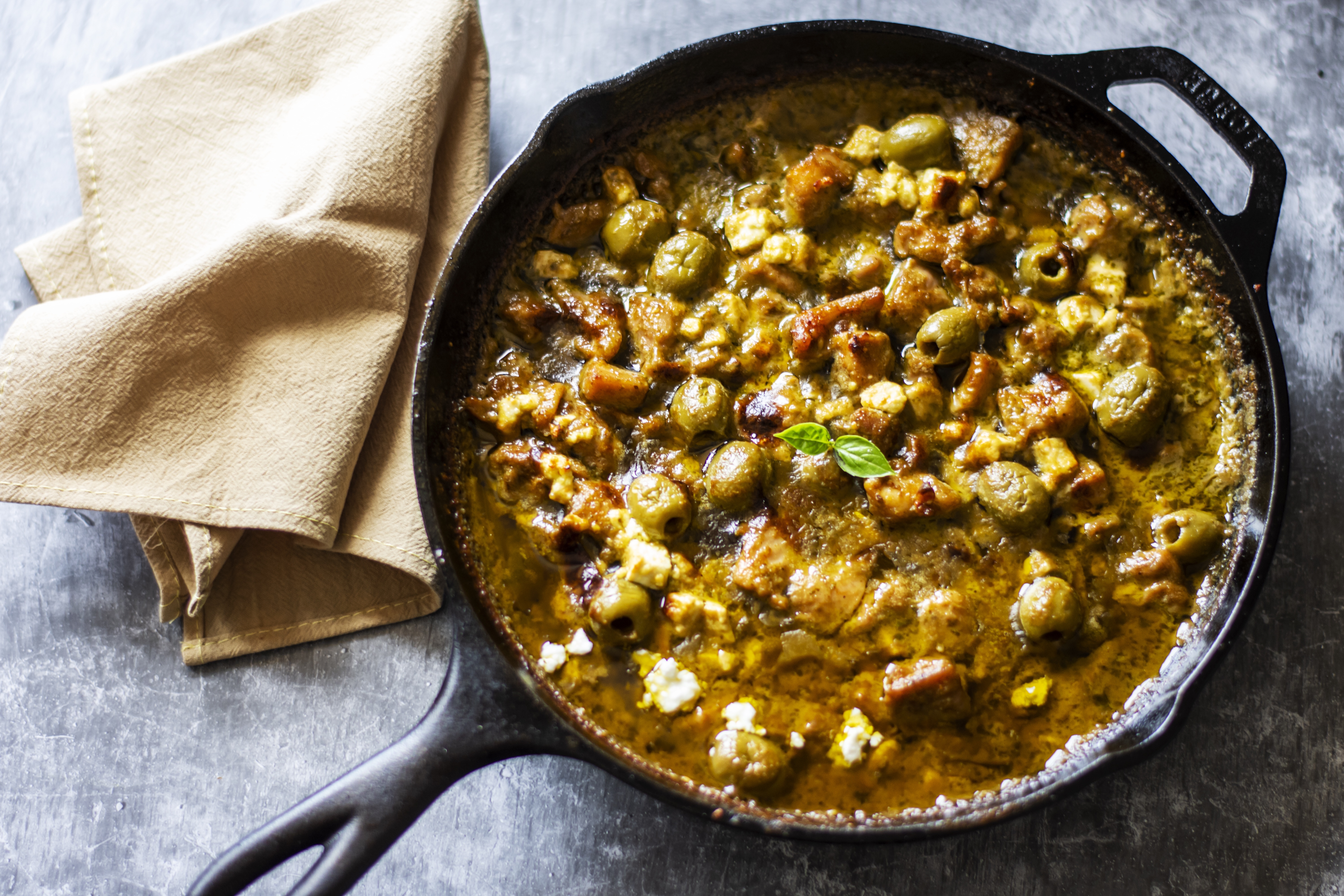 Add the creamy pesto sauce, feta cheese and olives into the pan and mix it all well and cook for a minute.