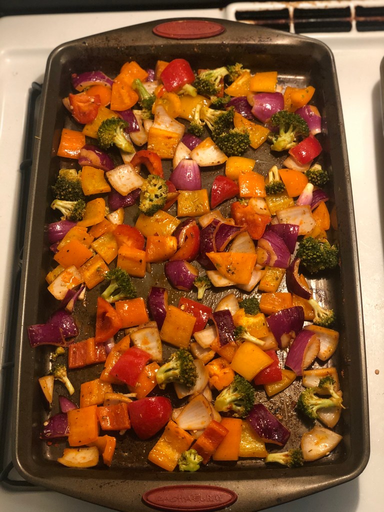 Toss the bell peppers, onions and broccoli with half the spice paste and place it in a baking tray and roast them for 25 minutes.