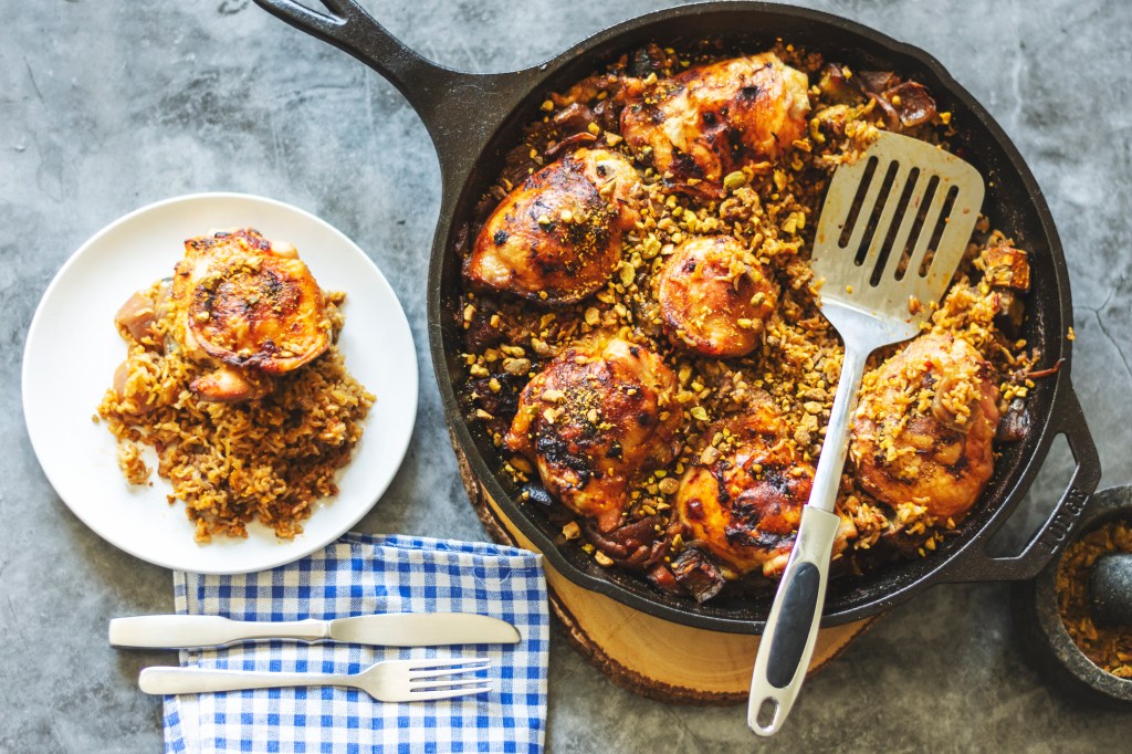 Season the chicken pieces with remaining harissa paste, ground cumin, ground ginger, salt and pepper and place them skin side up.