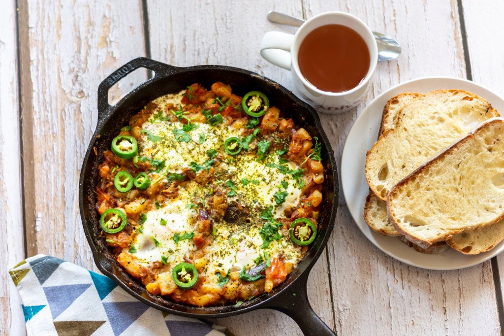 Garnish the eggs with crushed dried fenugreek (if using), sliced jalapenos and cilantro.