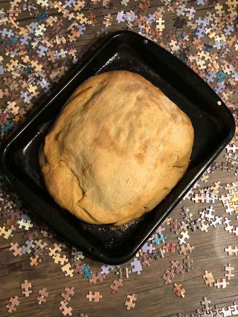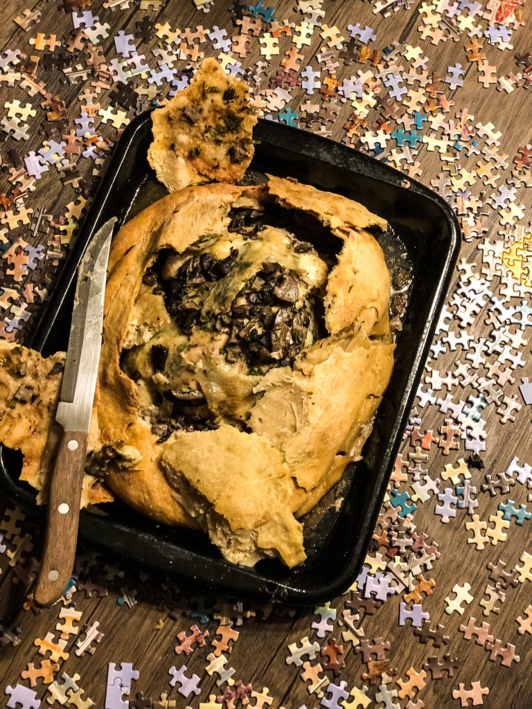 Roll out the dough to 1 cm thickness, spread some of the mushroom filling over the dough and then place the chicken over the mushroom and then cover the chicken all over with mushroom butter. Wrap the dough around the chicken and make sure it is sealed properly.
