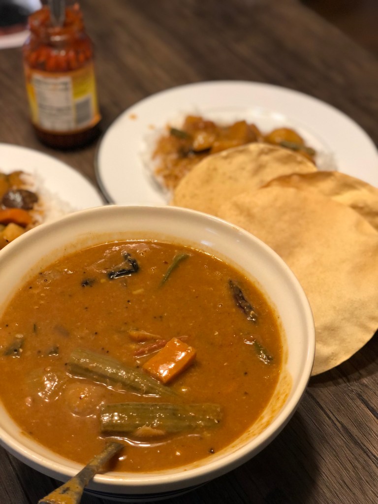Add the tempering mixture to the sambar and let it sit for a couple of minutes and then give it a mix.