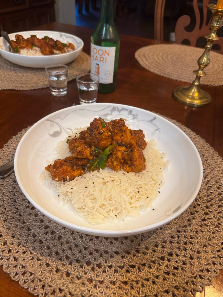 Serve it with white rice/fried rice and add sesame seeds on top for garnish.