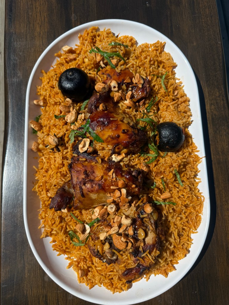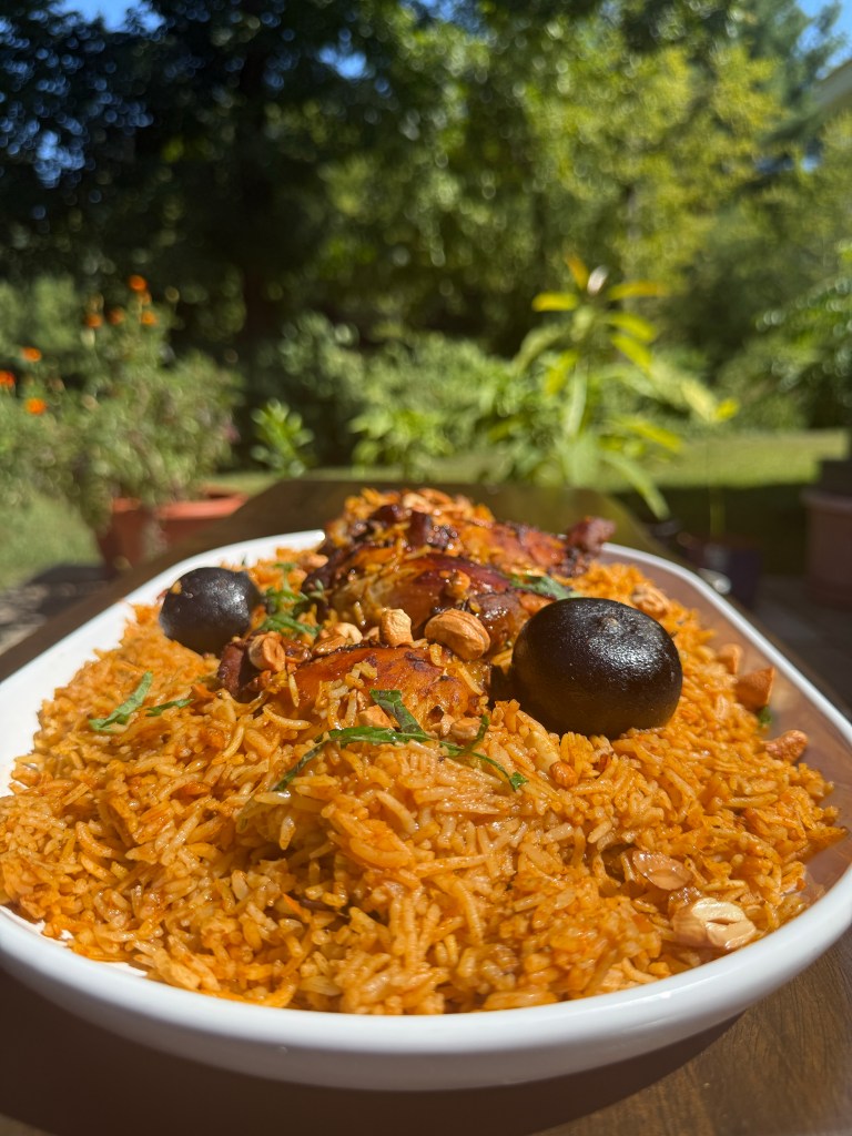 To serve, spoon out the rice into a serving plate. Place the roasted chicken things over the rice. Finally pour the roasted almonds/cashews over the rice along with ghee. Drizzle the mint leaves if using while serving.